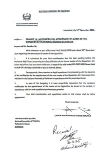 خط میں مزید کہا گیا ہے کہ موجودہ صورتحال میں قومی اسمبلی کے قواعد و ضوابط اور پارلیمانی روایات کے مطابق نئے قائدِ حزبِ اختلاف کی تقرری میں مزید تاخیر مناسب نہیں۔ اپوزیشن کی جانب سے محمود خان اچکزئی کو قومی اسمبلی میں قائدِ حزبِ اختلاف نامزد کیا گیا ہے، اور اب اس نامزدگی کا باضابطہ نوٹیفکیشن جاری ہونا باقی ہے۔
